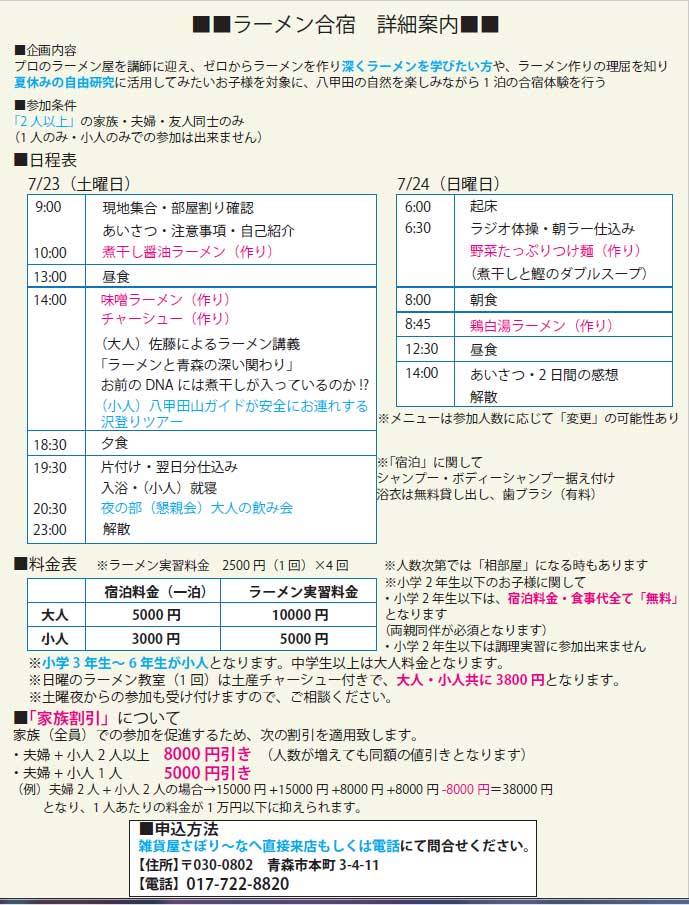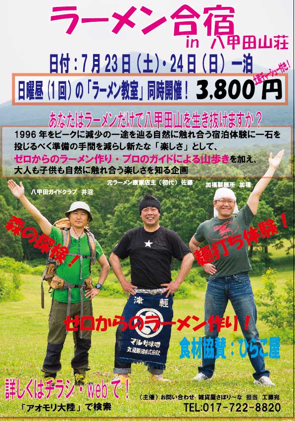 プロのラーメン屋を講師に迎え、ゼロからラーメンを作り深くラーメンを学びたい方や、ラーメン作りの理屈を知り夏休みの自由研究に活用してみたいお子様を対象に、八甲田の自然を楽しみながら1泊の合宿体験を行う